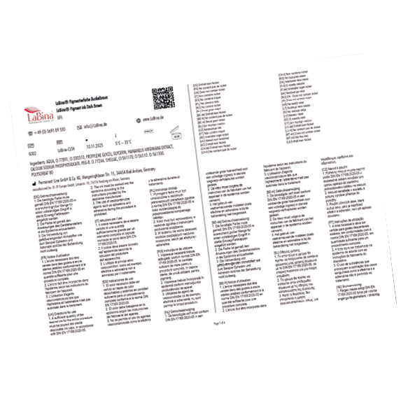 LaBina® Product Quality Pigmentierfarben werden mit den durch die REACH Verordnung gesetzlich vorgeschriebenen Angaben geliefert. Zu jeder Charge gelieferter Pigmentierfarben erhalten Sie Begleitpapiere, die alle relevanten Informationen - einschließlich der ausführlichen Analyseauswertungen - beinhalten.