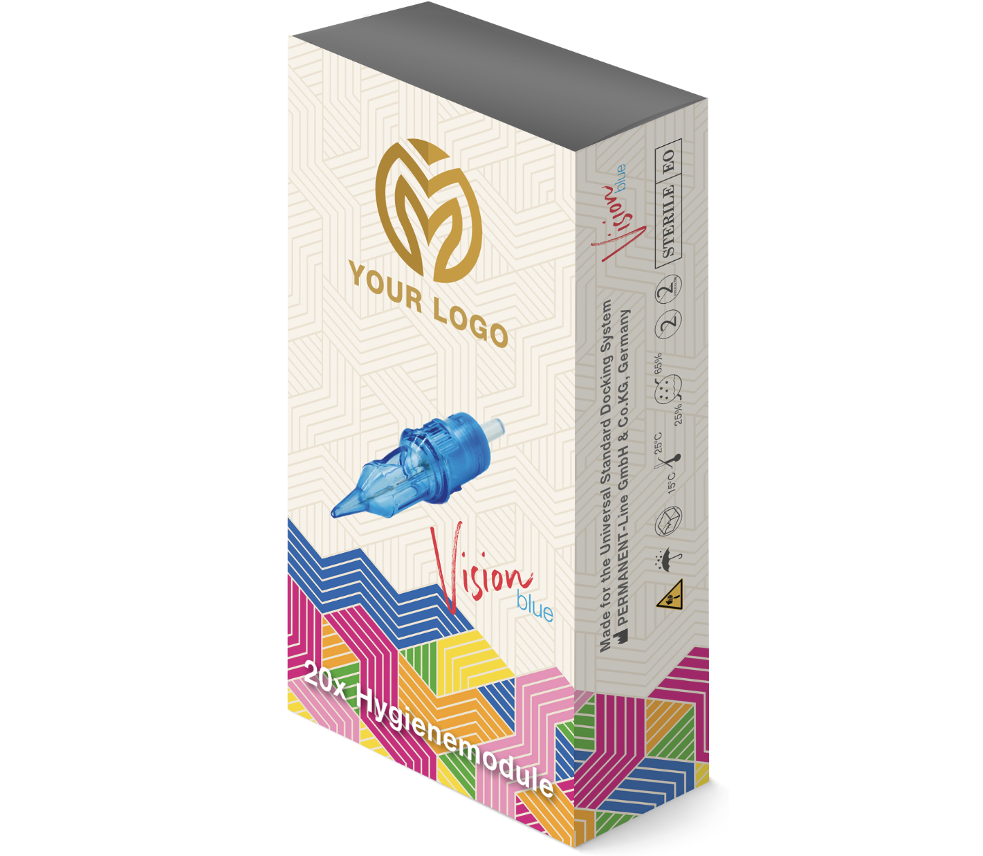 Neben den Farben-Sets erhalten Sie auch die Nadelmodule in einer Box mit individuell gestalteter Banderole. Das sorgt für ein einheitliches und professionelles Erscheinungsbild. Durch das Universal Docking System passen die Vision Blue® Nadeln auf unzählige Pigmentiergeräte.