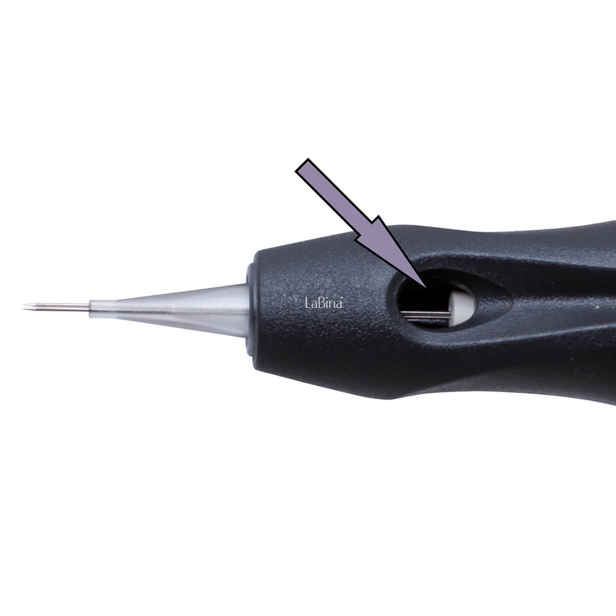Let op! Wanneer u te vaak met een 1-delige naald in dezelfde lijn tekent, geeft dat snijwonden in de huid. Het gevolg is zichtbare littekens! 1-delige Liner-hygiënemodules zijn slechts beperkt bruikbaar voor fijne ooglijnen.