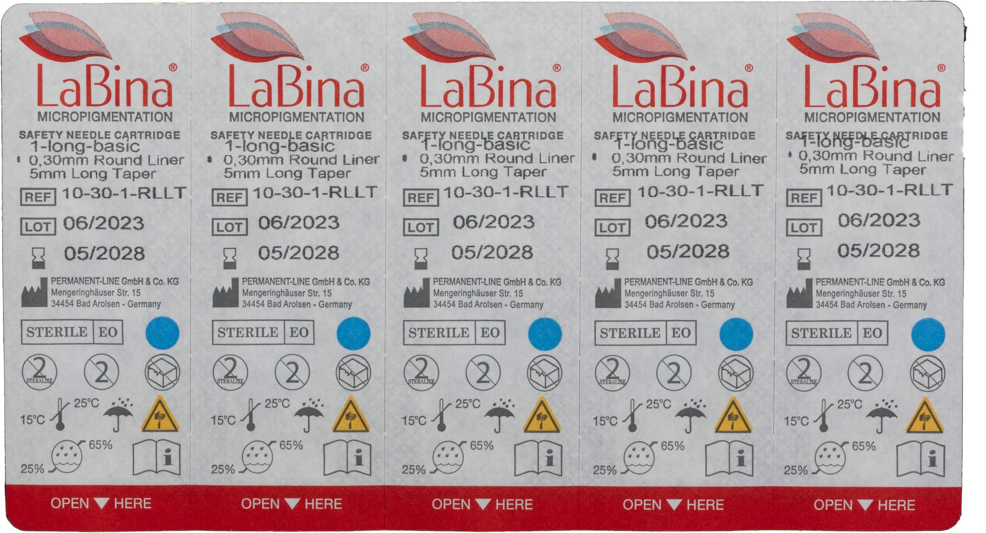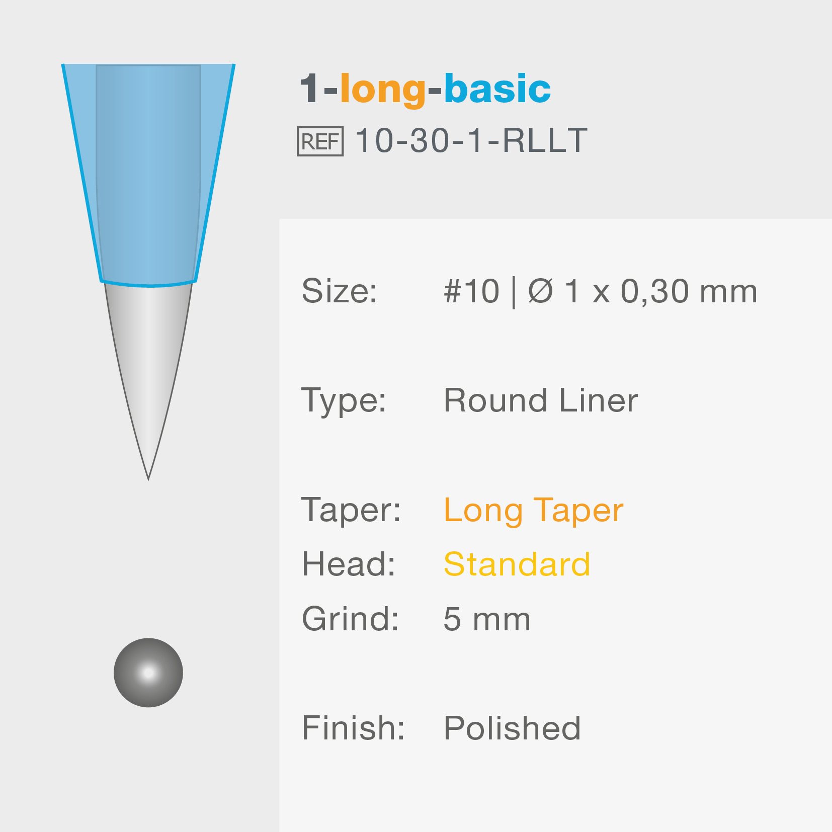 Long Taper naalden, met een 5mm lange geslepen standaard naaldkop, zijn niet zo extreem puntig aan de naaldpunt als de Bug Pin naalden. Ze behoren tot de dunne naalden uit de Vision blue serie van LaBina.