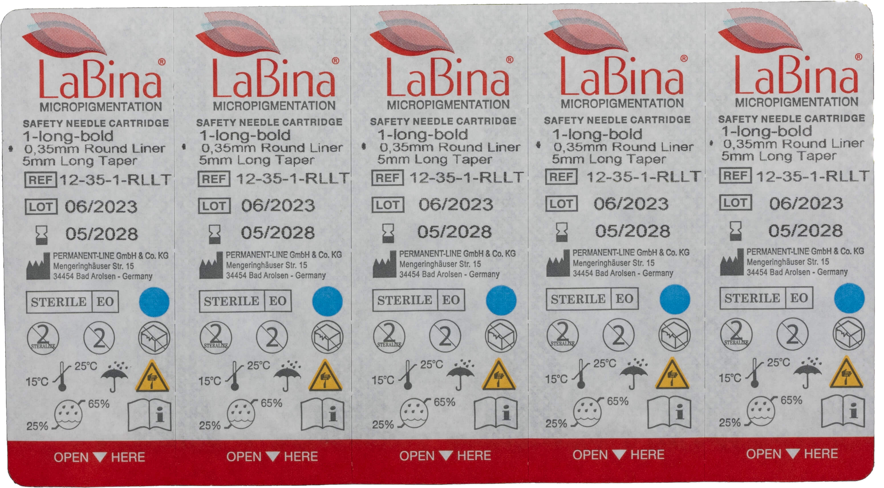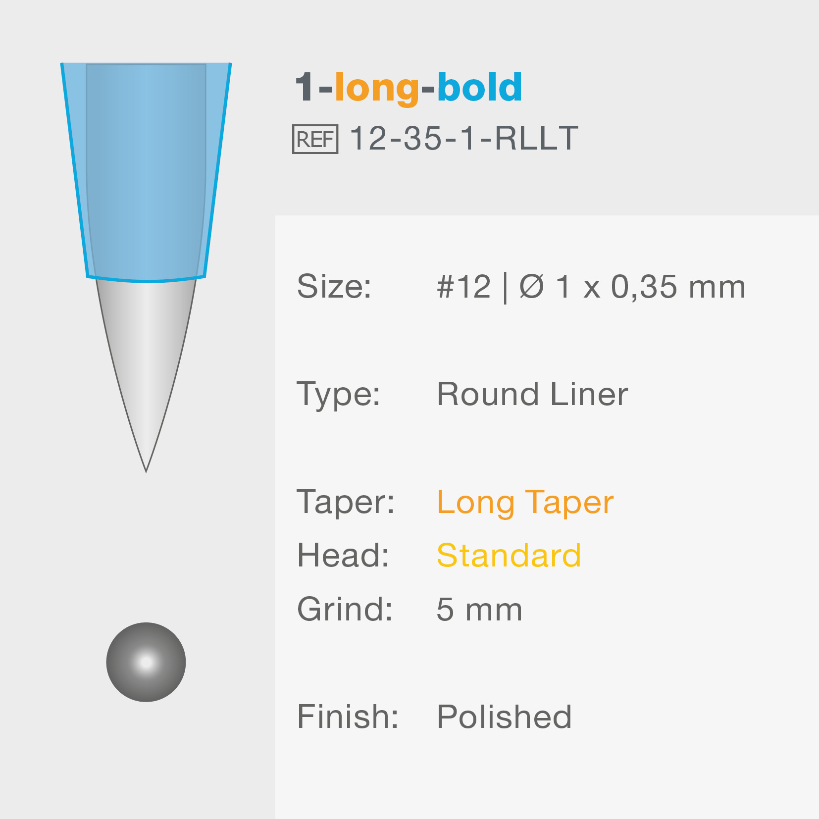 Long Taper naalden, met een 5mm lange geslepen standaard naaldkop, zijn niet zo extreem puntig aan de naaldpunt als de Bug Pin naalden. Ze behoren tot de dunne naalden uit de Vision blue serie van LaBina.