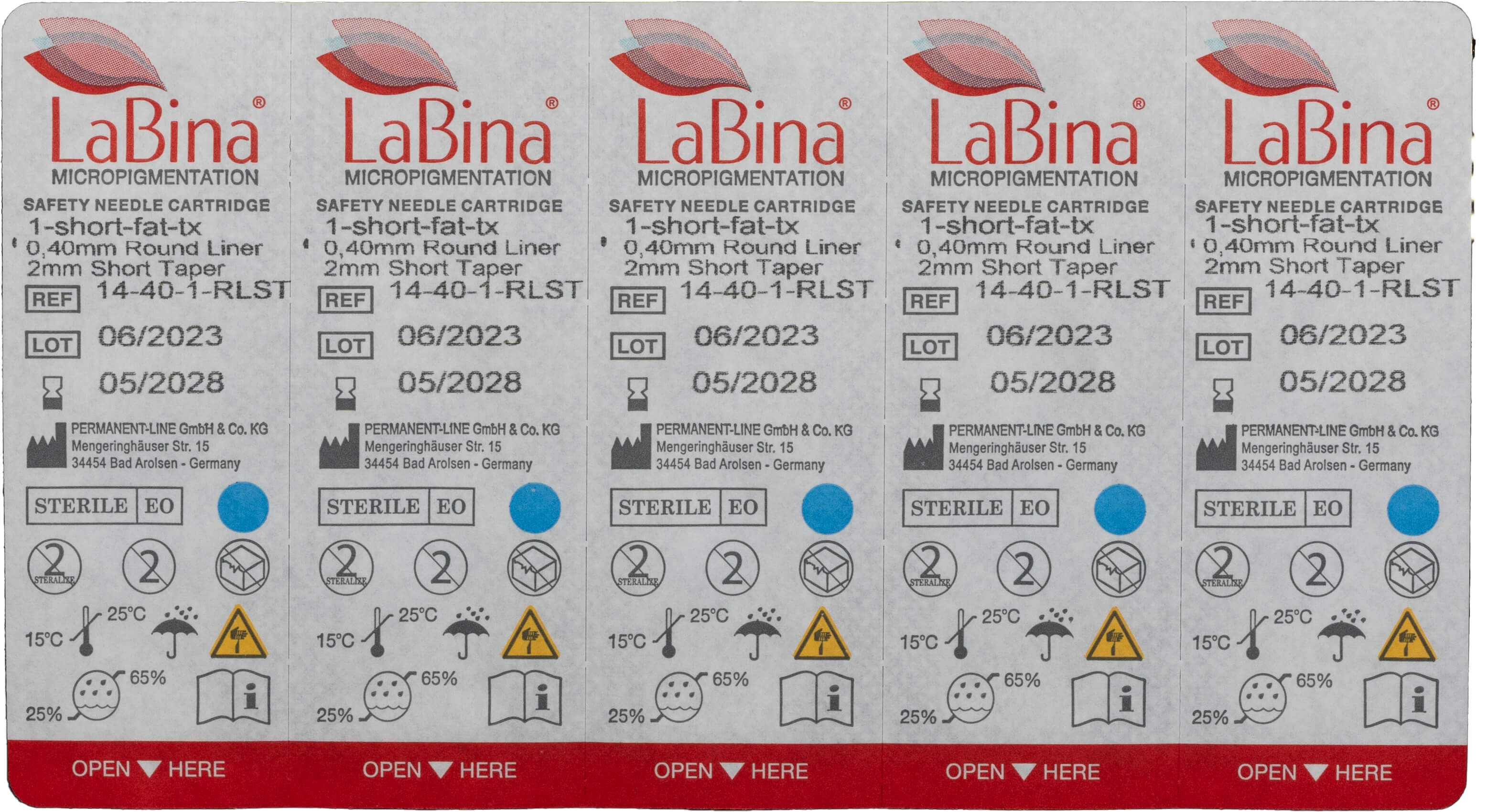 Short Taper naalden hebben een zeer korte geslepen standaard naaldkop. Met een diameter van 0,4 mm lijkt de naald optisch op een speld. De punt van de naald is veruit de dikste naald in de Vision blue serie van LaBina.