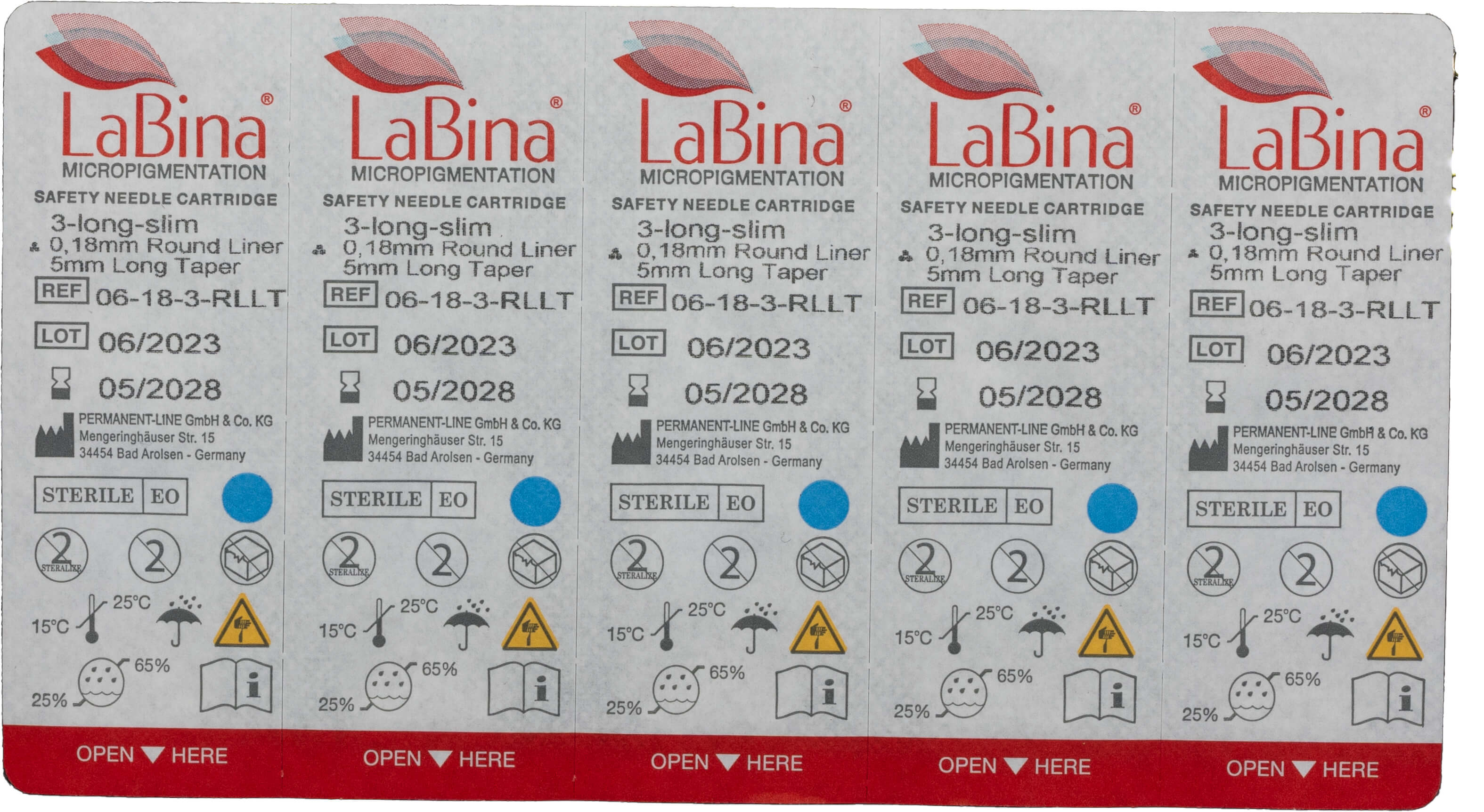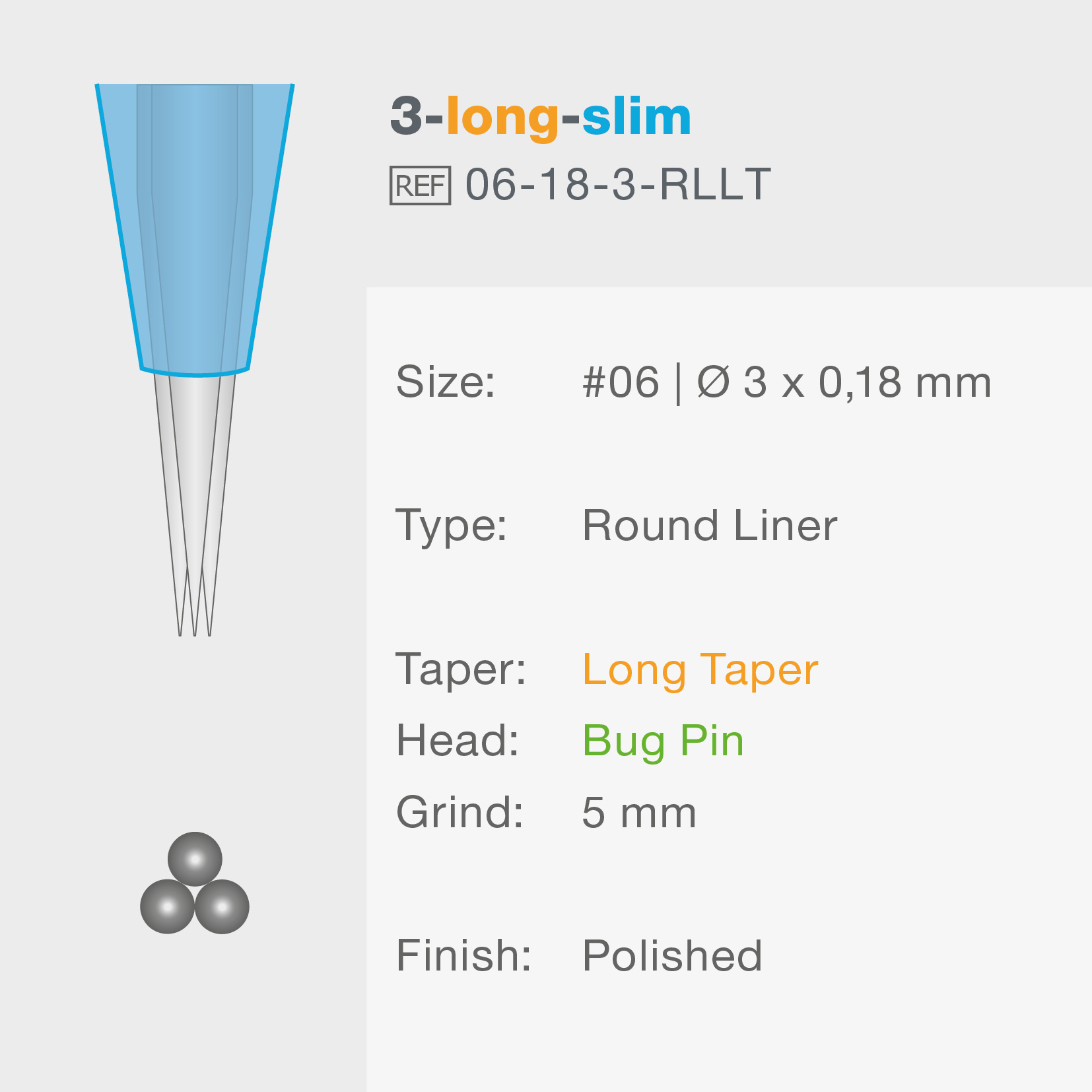 Long Taper naalden, met een 5mm lange geslepen Bug Pin naaldkop, zijn veruit de dunste naalden in de Vision blue serie van LaBina aan de punt van de naald. Bij Round Liner naalden liggen de afzonderlijke naaldpunten heel dicht bij elkaar. De naalden werken als een enkele dikke naald, maar met de voordelen van een meervoudige naald.