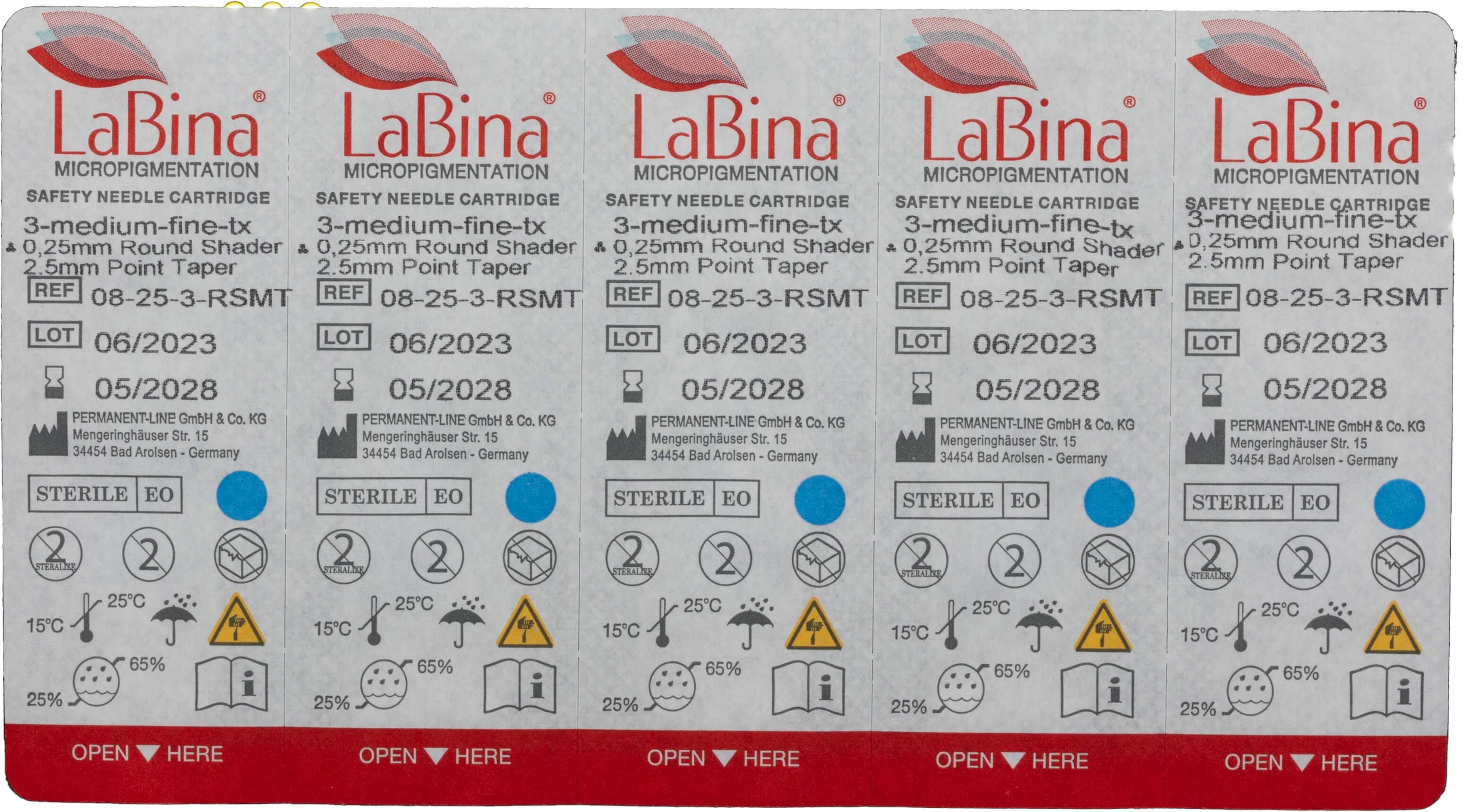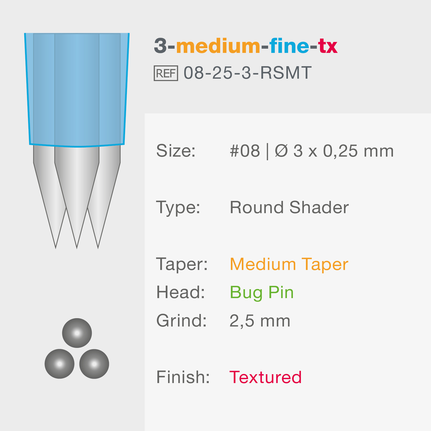 Medium Taper naalden, met een Bug Pin naaldpunt die slechts 2,5 mm lang is, zijn aanzienlijk dikker aan de voorkant van de naalden dan Long Taper naalden. Als Round Shader naald liggen de individuele naaldpunten aanzienlijk verder uit elkaar dan bij Round Liner naalden. Round shaders zijn ideaal voor dikkere lijnen, voor lichte arceringen van de huid en ook voor het invullen van gebieden met kleur. Elke individuele naald creëert een kleine, schone prik zonder de huid onnodig te beschadigen.