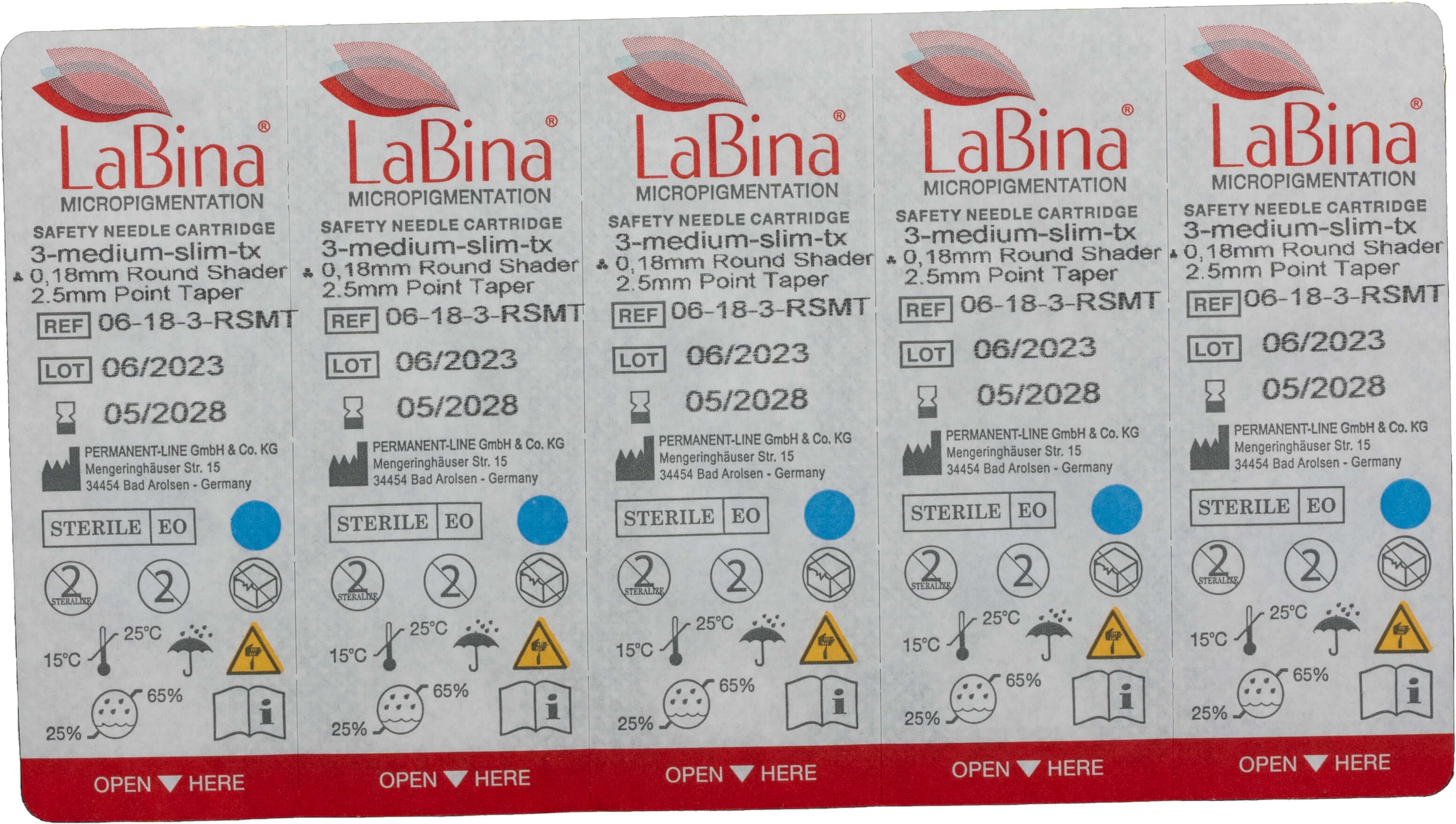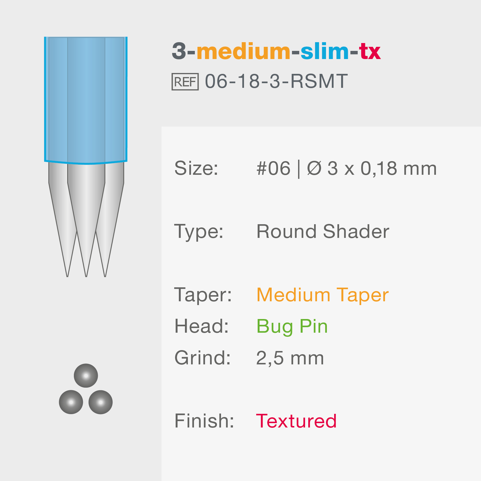 Medium Taper naalden, met een Bug Pin naaldpunt die slechts 2,5 mm lang is, zijn aanzienlijk dikker aan de voorkant van de naalden dan Long Taper naalden. Als Round Shader naald liggen de individuele naaldpunten aanzienlijk verder uit elkaar dan bij Round Liner naalden. Round shaders zijn ideaal voor dikkere lijnen, voor lichte arceringen van de huid en ook voor het invullen van gebieden met kleur. Elke individuele naald creëert een kleine, schone prik zonder de huid onnodig te beschadigen.