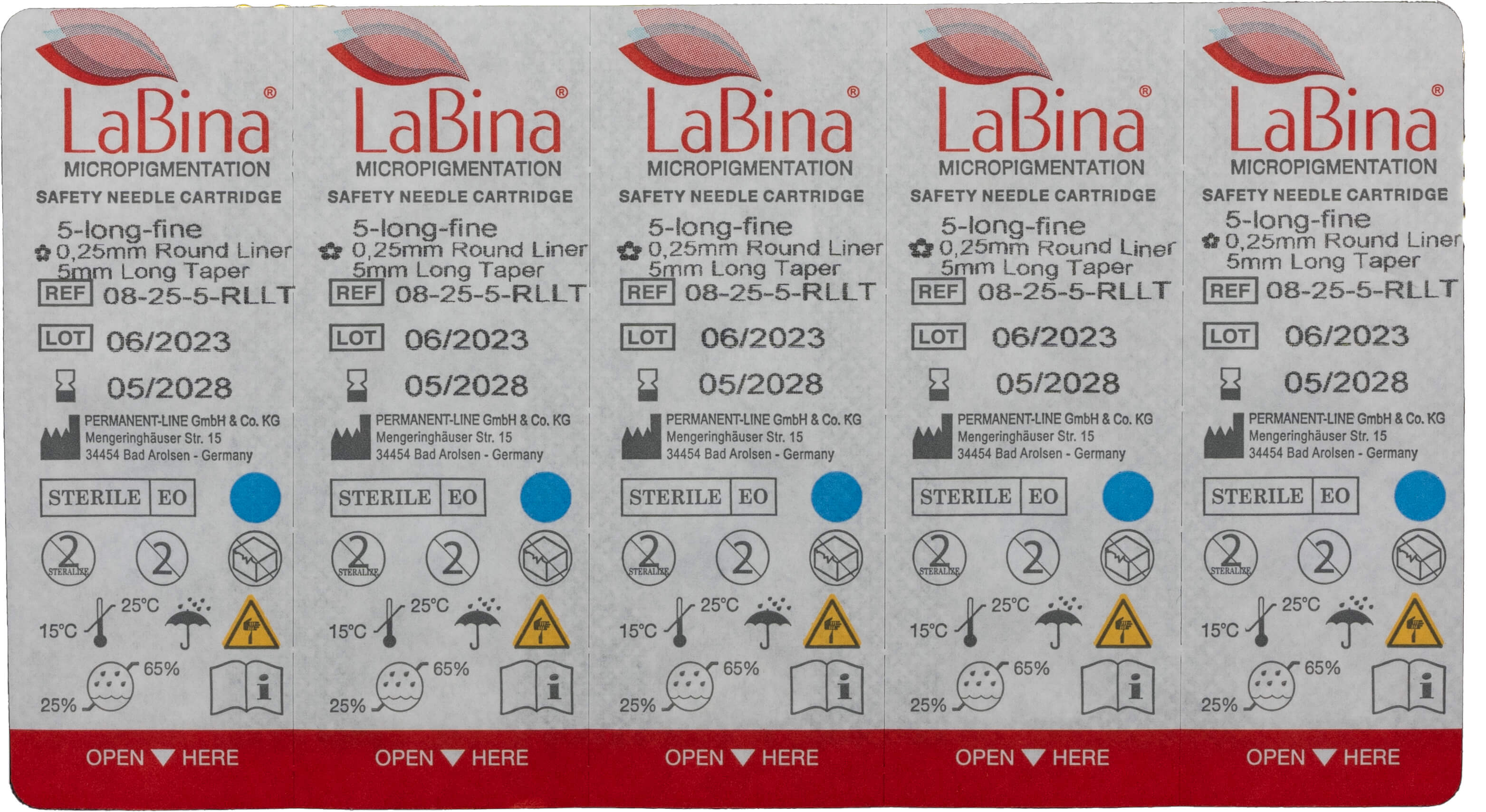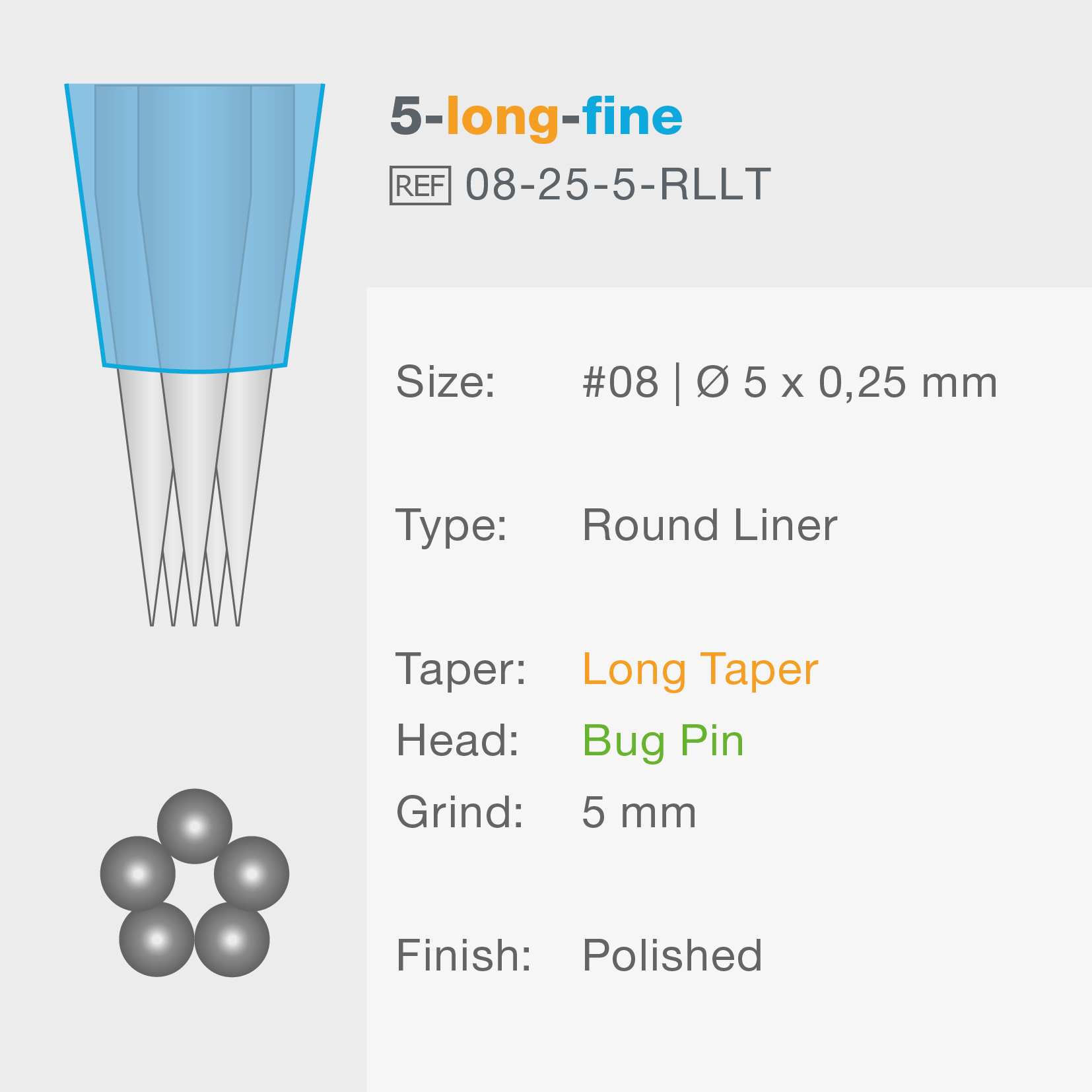 Long Taper naalden, met een 5mm lange geslepen Bug Pin naaldkop, zijn veruit de dunste naalden in de Vision blue serie van LaBina aan de punt van de naald. Bij Round Liner naalden liggen de afzonderlijke naaldpunten heel dicht bij elkaar. De naalden werken als een enkele dikke naald, maar met de voordelen van een meervoudige naald.