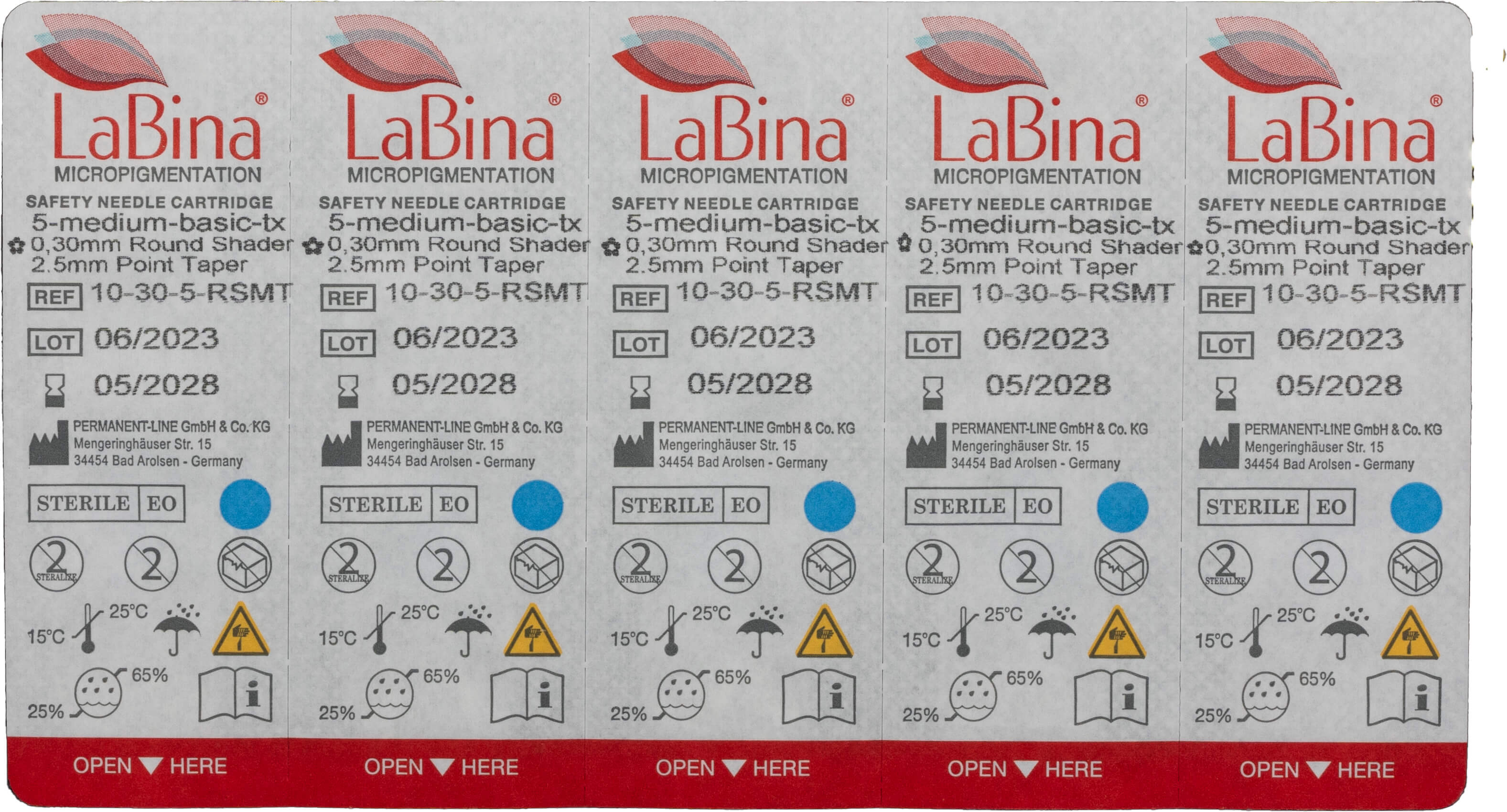 Long Taper naalden, met een 5mm lange geslepen Bug Pin naaldkop, zijn veruit de dunste naalden in de Vision blue serie van LaBina aan de punt van de naald. Bij Round Liner naalden liggen de afzonderlijke naaldpunten heel dicht bij elkaar. De naalden werken als een enkele dikke naald, maar met de voordelen van een meervoudige naald.